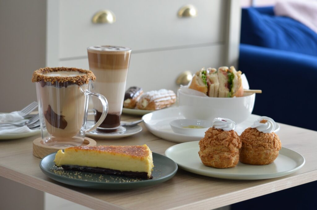 Durante nuestra visita, nos ofrecieron una selección exquisita: profiteroles rellenos de crema pastelera, choux craquelin con manjar y reducción de frambuesas, y una tarta crème brûlée sobre base sable de chocolate. El toque salado fue un sándwich ciabatta capresse con prosciutto y rúcula, y bebidas calientes que encantan tanto por su sabor como por su presentación: un capuccino con Nutella y un mocaccino intenso con leche texturizada y cacao. Sus vitrinas son una verdadera tentación y, después de probar, no quedan dudas, definitivamente, volveremos para disfrutar de toda su Carta.