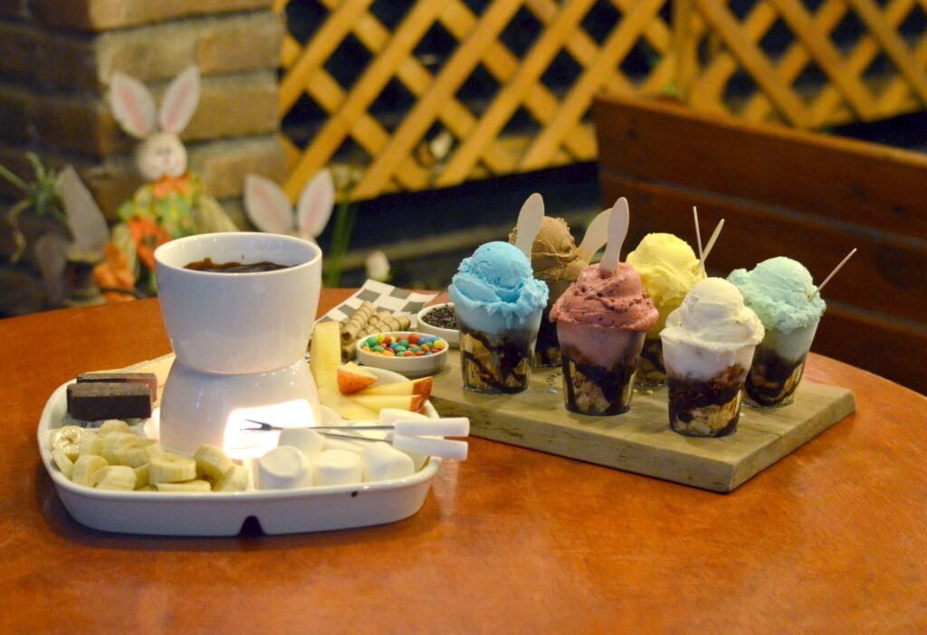 En nuestra visita, nos ofrecieron una combinación de sus productos estrella y aplaudidos por sus clientes durante todo el año: una tabla de helados artesanales, decorada con toppings dulces y salsas caseras, que demuestra que el helado también tiene su lugar en los días fríos. También degustamos una fondue de chocolate, ideal para disfrutar y compartir, con frutas, marshmallows y galletas, y, por supuesto, un buen café con pastel casero, sello inconfundible de la casa. Todo servido fresco, con calidez y cercanía, en un ambiente que invita a quedarse, conversar… y volver.