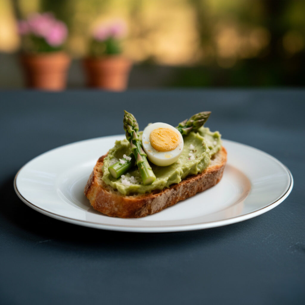 -Nido de codorniz Puré de palta, huevo cocido de codorniz partido en mitades, puntas de espárragos, pizca de sal y pimienta. Cremosa y divertida.