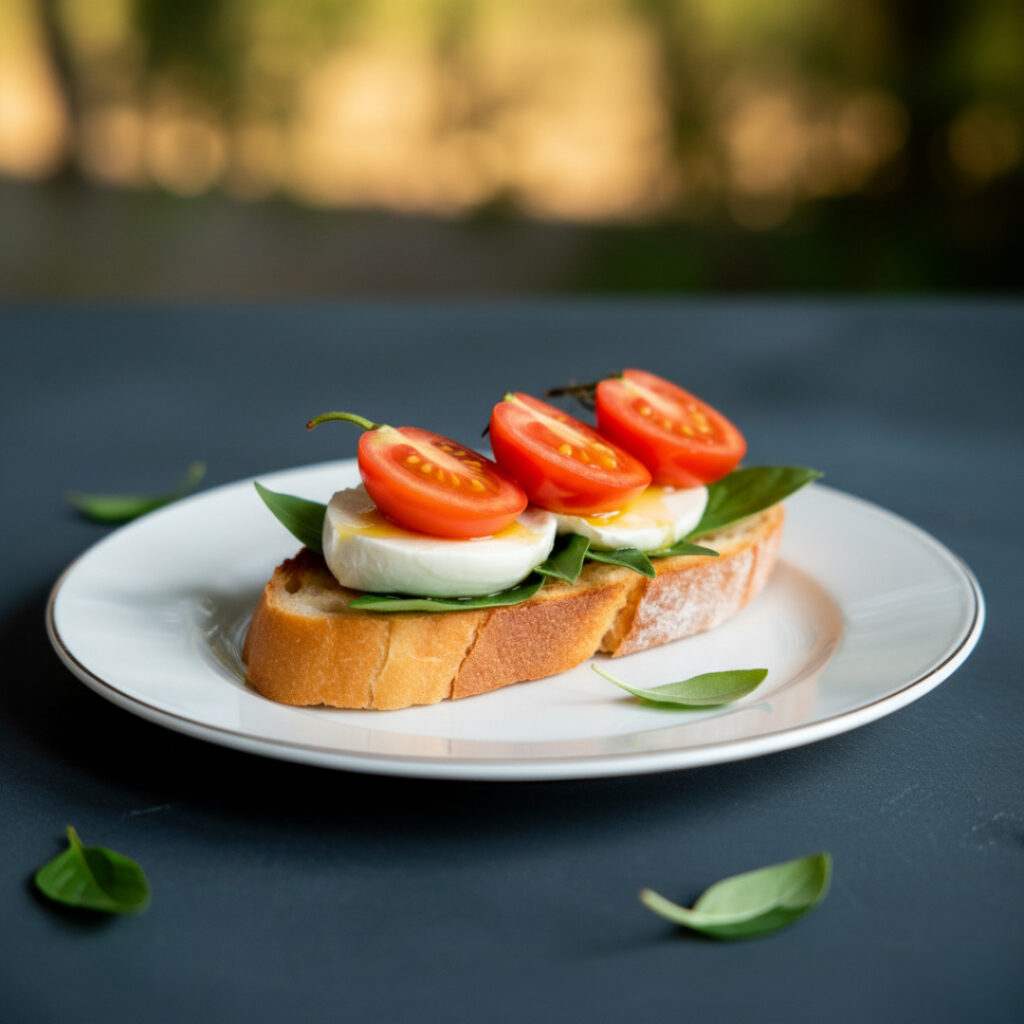 Caprese Tomate cherry cortado a la mitad, mozzarella fresca y hojas de albahaca. Un hilo de aceite de oliva y ¡listo!