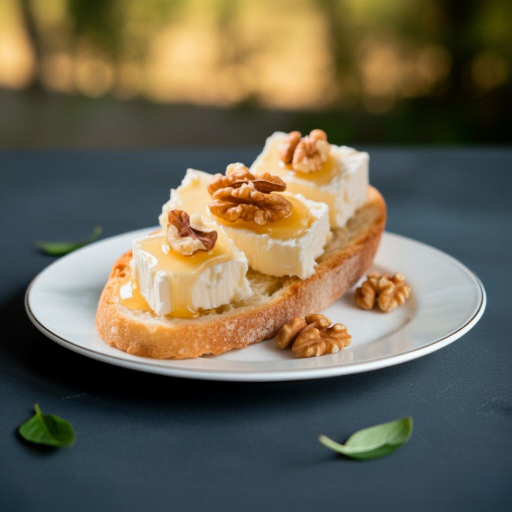 Queso de cabra con miel y nueces Queso de cabra en cubitos, untado en miel y decorado con nueces picadas. Crujiente, dulce y salado en cada bocado.