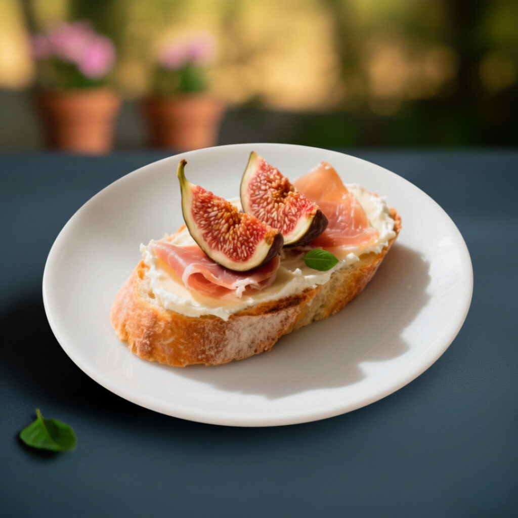 Queso crema, prosciutto e higos Queso crema untado sobre el pan, prosciutto delgado e higos frescos en gajos. Una explosión dulce-salada que parece salida de un banquetero profesional.