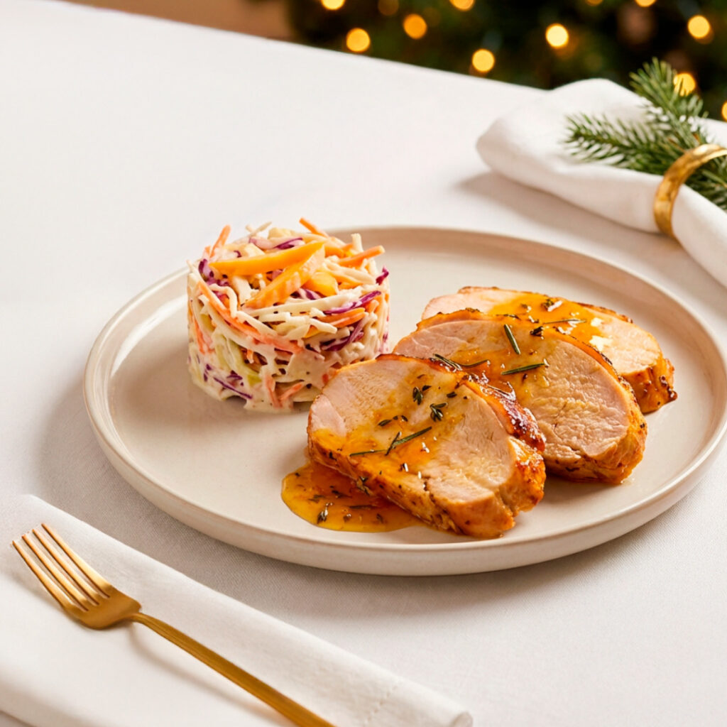 Seguramente muchos de ustedes ya tienen un plato tradicional para las cenas de Navidad o Año Nuevo, y me incluyo, porque yo he replicado por años el menú que se preparaba en mi casa cuando era niña…Pero en medio del ajetreo de diciembre, lo que menos tenemos es tiempo y la idea es disfrutar estas fiestas y no complicarse pasando horas en la cocina. Por eso les comparto esta receta de pavo muy simple y aromática, acompañada con una dulce versión de coleslaw, un menú lleno de sabor, perfecto para estas celebraciones.
